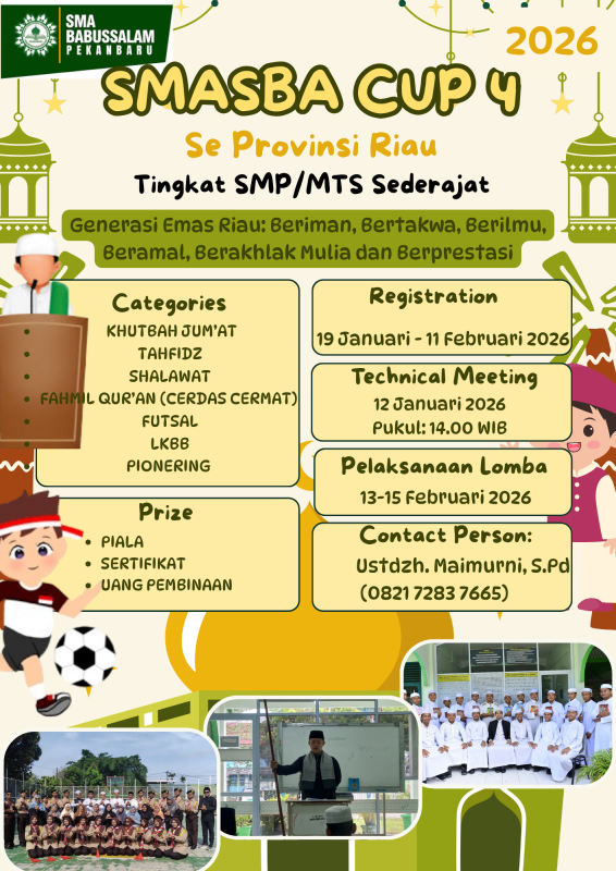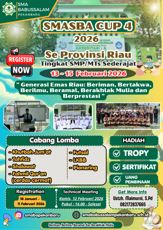 Pekanbaru, 23 Januari 2026 – SMA Babussalam Pekanbaru kembali menggelar ajang prestisius SMASBA Cup ke-4 tahun 2026, sebagai panggung gemilang bagi talenta muda siswa/siswi SMP dan MTs se-Provinsi Riau. Event inspiratif ini direncanakan berlangsung pada 13 hingga 15 Februari 2026, menjanjikan tiga hari penuh semangat kompetisi yang mengasah bakat, iman, dan kekompakan.